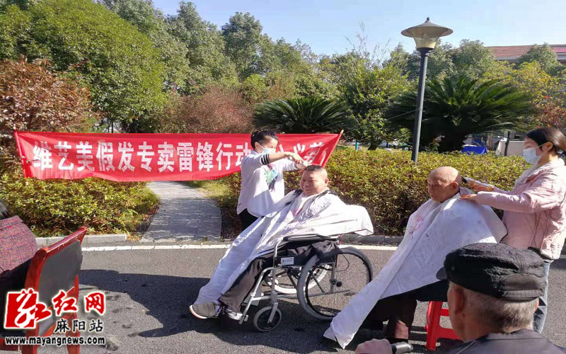 11月11日上午10点,麻阳苗族自治县颐和康养中心的大院内,老人们沐浴日光,享受着“爱心义剪”。颐和康养中心属民办养老机构,唯艺美假发专卖店的志愿者每个月都会来此探望老人们,给他们免费理发。